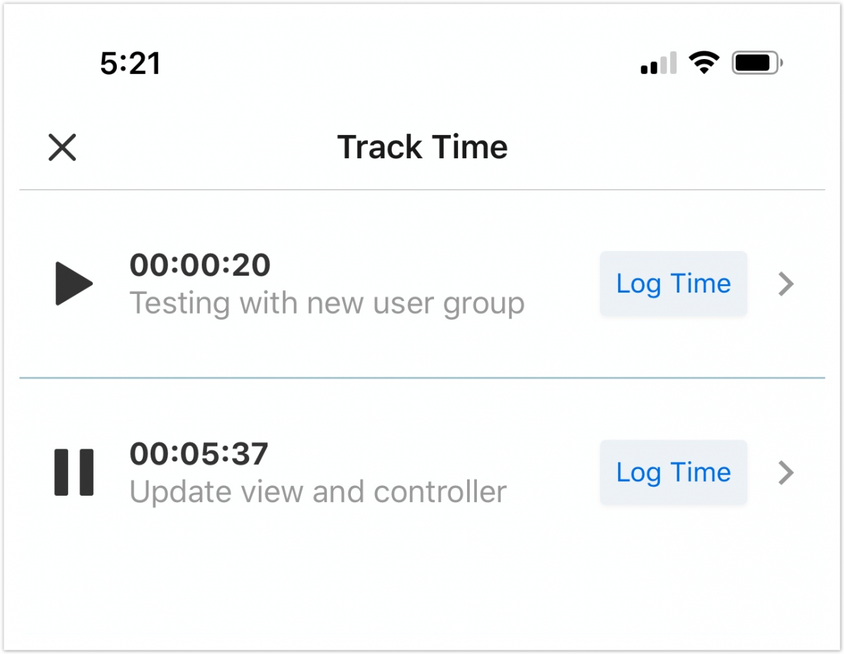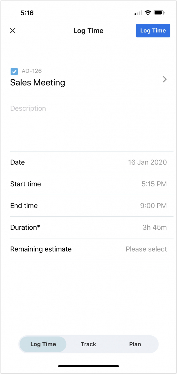 - На экране «Регистрация времени» "Log Time" вы можете выбрать любое поле для редактирования. Когда вы закончите, нажмите «Регистрация времени» "Log Time" в верхнем правом углу.