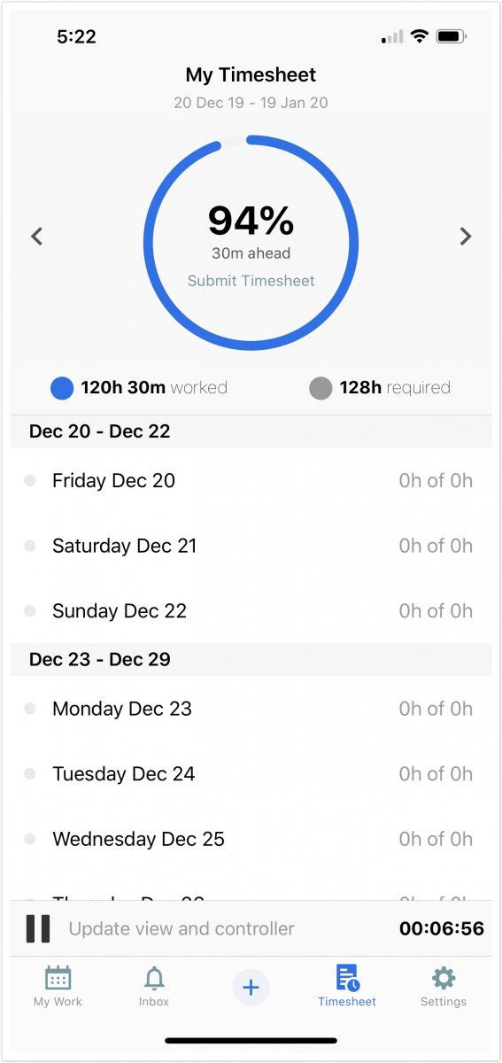 ("Timesheet") внизу. Текущее расписание отображается. - В верхней части экрана вы видите время отслеживания прогресса. Вы можете быстро перемещаться между периодами с помощью стрелок предыдущего (<) и следующего (>).