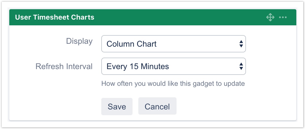 Гаджет "Диаграммы пользовательских расписаний" ("User Timesheet Charts") показывает ваше зарегистрированное время за текущий период. Данные могут отображаться с использованием круговой диаграммы, столбчатой диаграммы или диаграммы области.