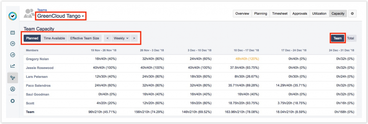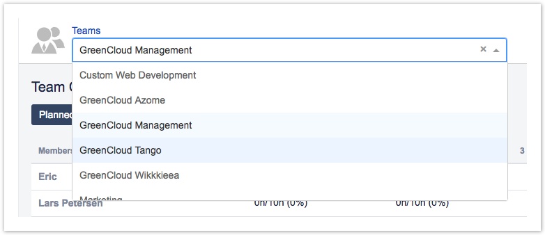 1. «Запланировано» ("Planned") - просмотр запланированного времени для команды в часах и в процентах от их общей занятости. Этот отчет учитывает только доступное время членов для текущей выбранной команды. Члены команды могут быть перераспределены в другой команде, если их членство разделено.