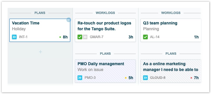 Планы помечены иконками , а рабочие журналы  иконкой . Когда вы записали время в соответствие с планами, значок плана станет серым, чтобы указать происхождение рабочего журнала.
