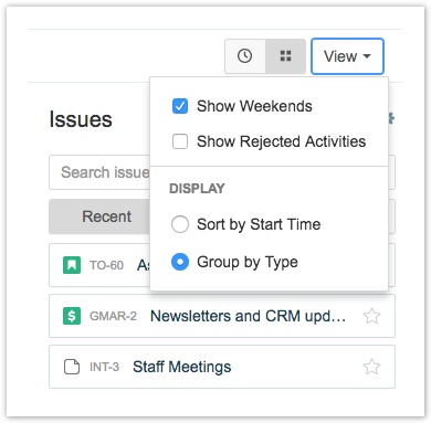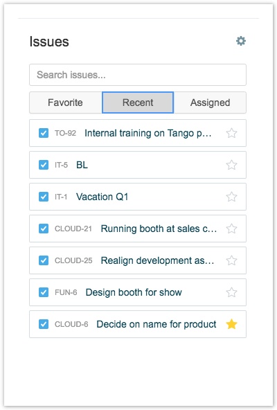 Боковая панель «Задачи» отображается в правой части «Мой рабочий календарь», показывая задачи Jira из предопределенных поисков JQL. Вы можете перетащить задачи из боковой панели прямо в «Календарь» ("Calendar"). Откроется диалоговое окно «Регистрация времени» ("Log Time"), и вы можете ввести отработанное время. Чтобы развернуть боковую панель, нажмите справа внизу . Чтобы свернуть боковую панель, нажмите.