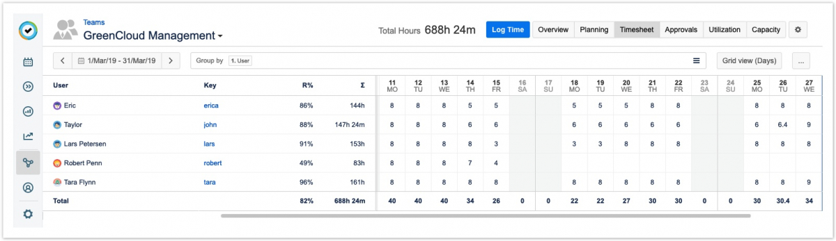 По материалам Tempo Server: Viewing the Team Timesheet