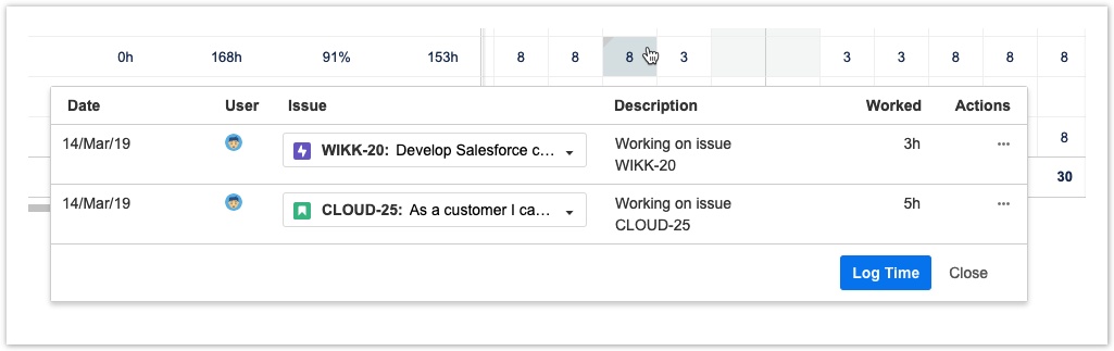 - Если у вас есть разрешение регистрировать время для других пользователей, вы можете щелкнуть пустую ячейку и заполнить диалоговое окно «Регистрация времени» ("Log Time"). Вы также можете использовать кнопку «Регистрация времени» ("Log Time") вверху.